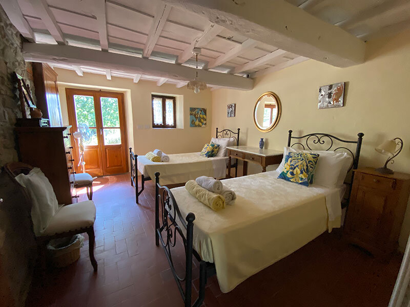 There are large arched doors from the dining room onto the patio where there is a large table, umbrella and chairs for eating outdoors. La Posticcia also has a stone BBQ on the patio. A few steps lead up to a lawn and pool area.
